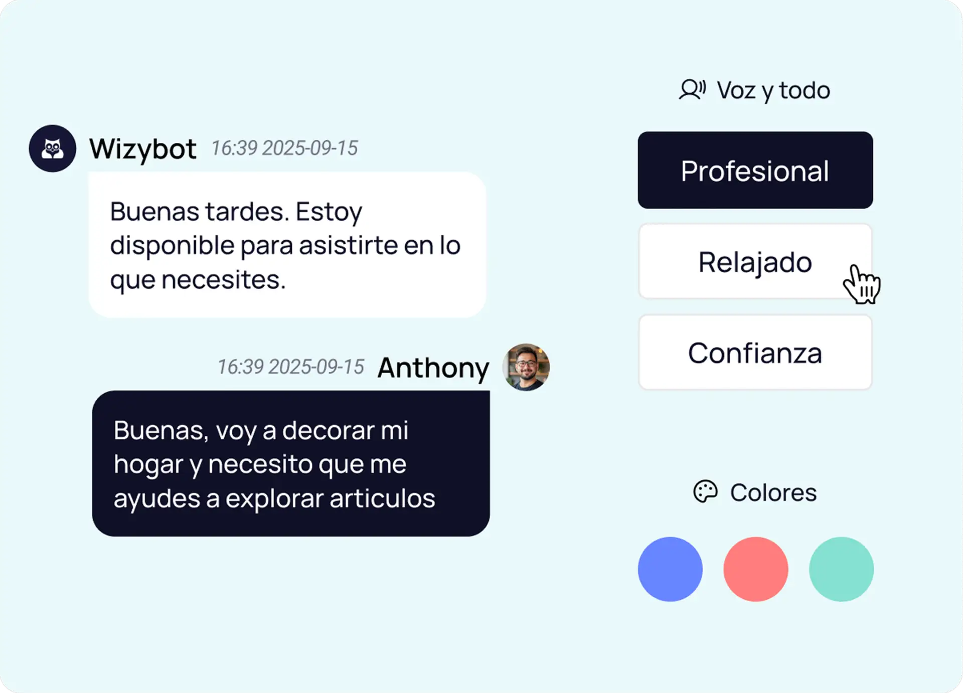 Wizybot se adapta a tu marca: personaliza su apariencia, comportamiento, acento y estilo de comunicación. Tu tienda, tu estilo.