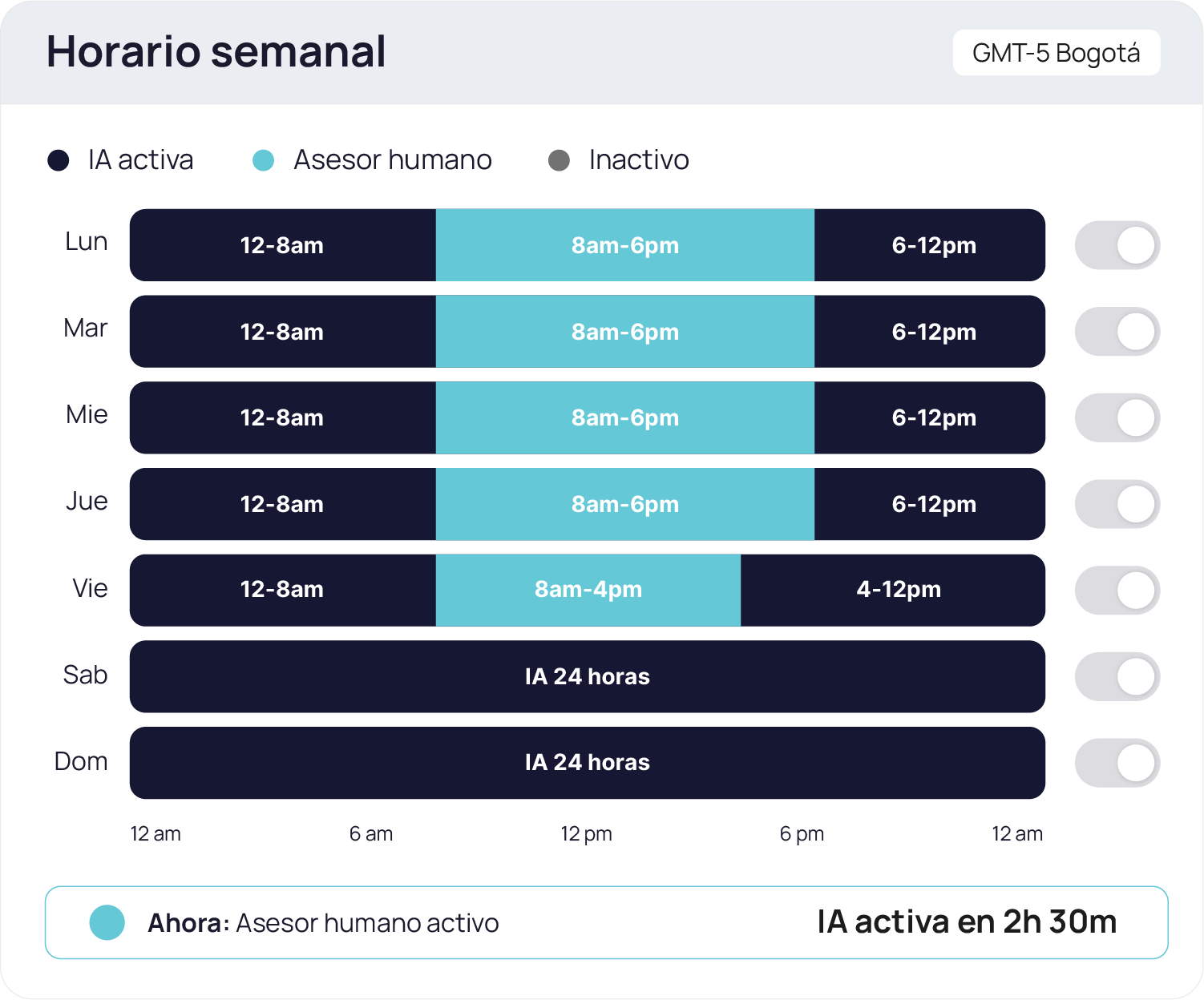 Activa la IA en los horarios y días que prefieras. Permite que los asesores contesten en ciertos horarios y la IA se encargue en los que prefieras.