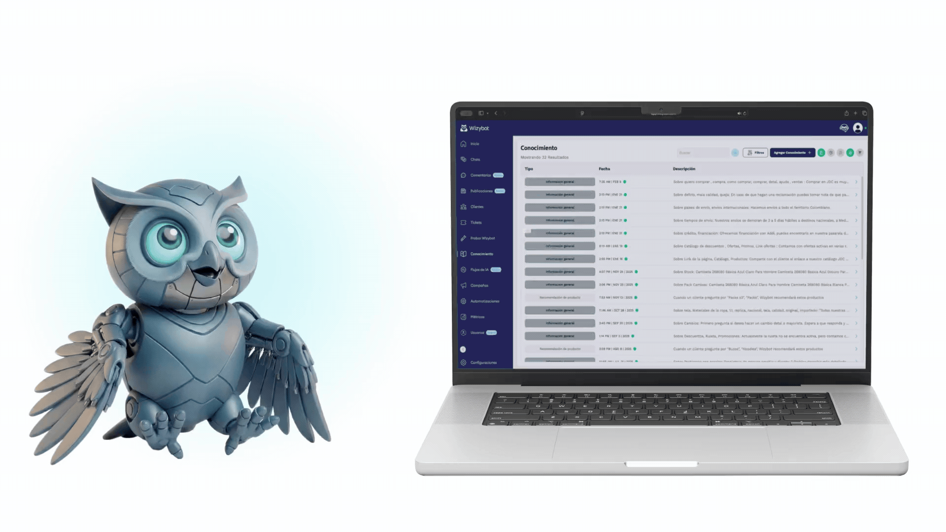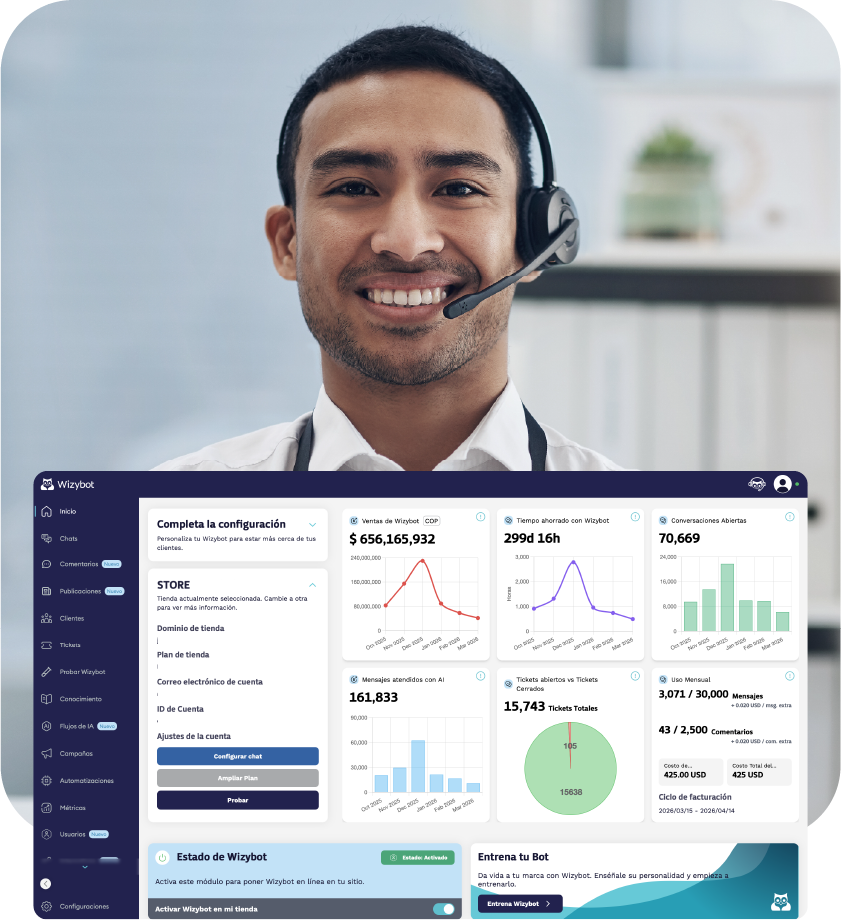 Conoce Wizybot, el Chatbot de IA para tu tienda Shopify, resuelve el 96% de consultas, unifica canales de chat y aumenta tus ventas 24/7 en más de 90 idiomas.