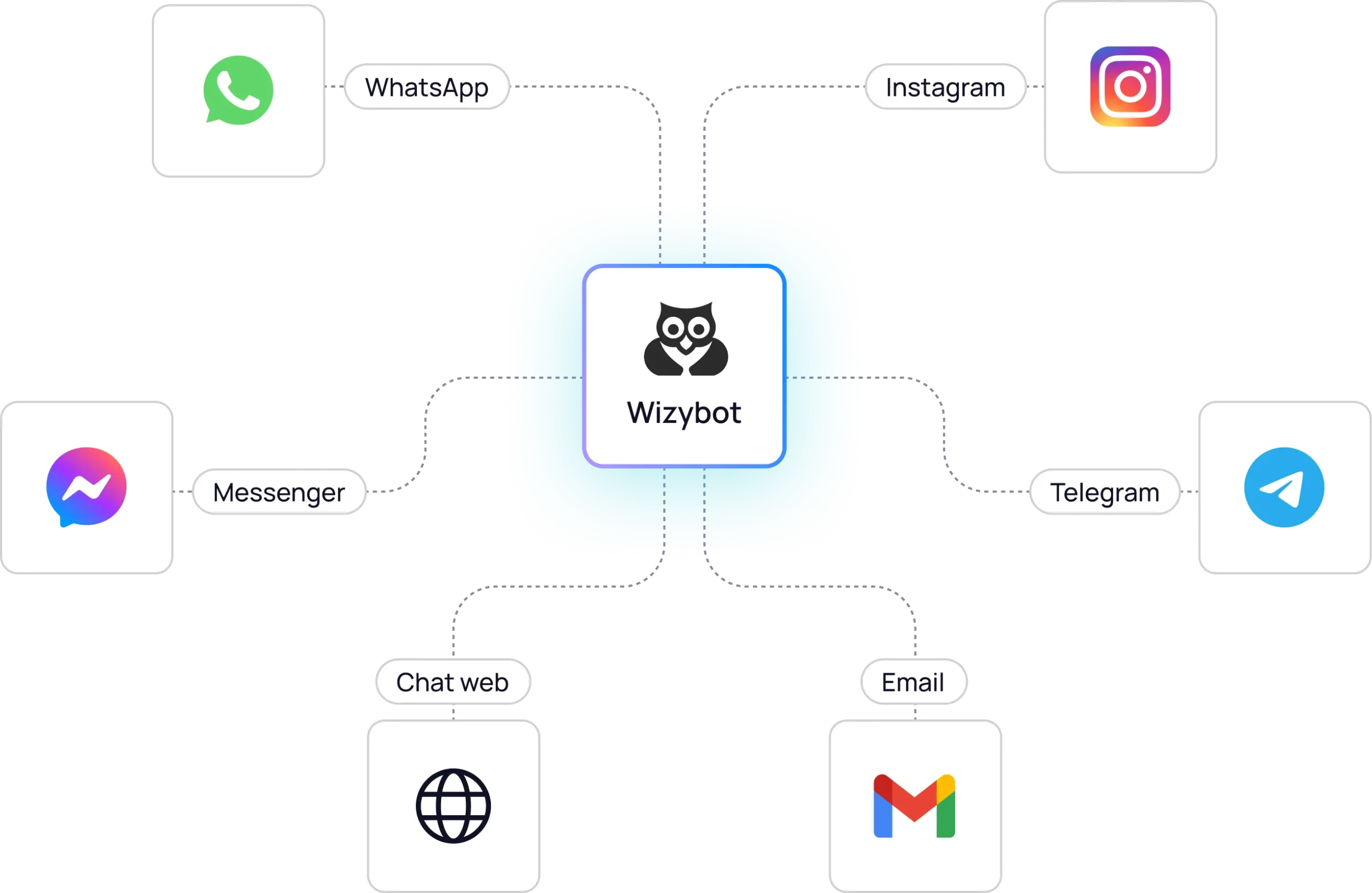 Con Wizybot, centraliza todos tus canales de atención en un solo ecosistema inteligente. Compatible con WhatsApp, Instagram, Messenger, Telegram y más, se integra fácilmente a tu tienda y responde el 96% de las consultas en más de 90 idiomas, 24/7. Todo en uno, sin fricciones.